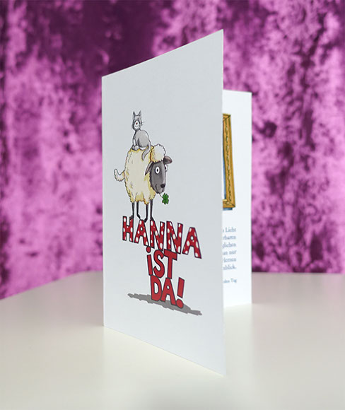 Beispiel individuelle Geburtskarte mit Glücksbringer-Motiv: Deckblatt mit Rückseite